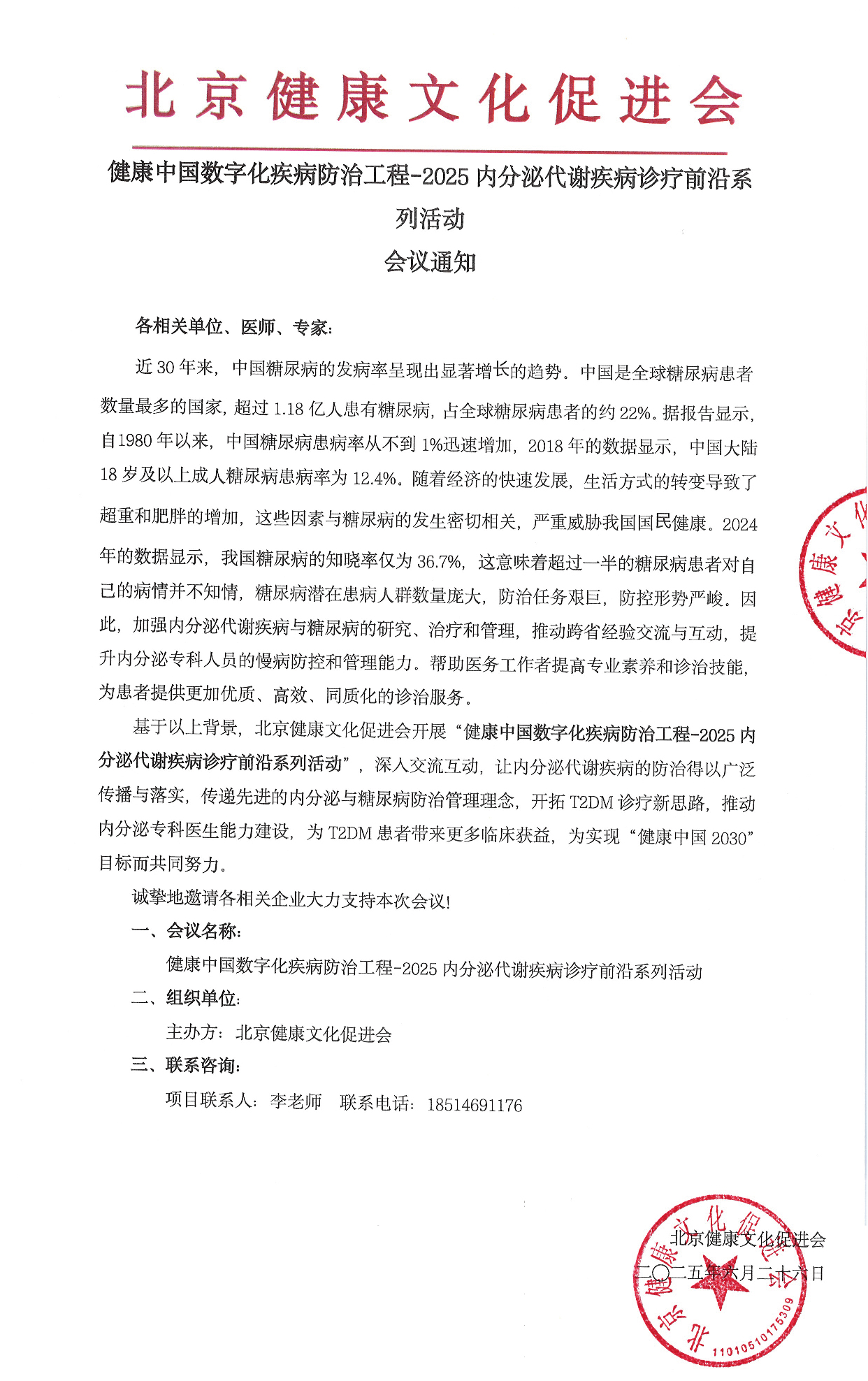 近30年来,中国慢性疾病的发病率呈现出显著增长的趋势,如何提高慢病诊疗水平、改善患者生活质量成为医疗界关注的焦点。在"健康中国数字化疾病防治工程" 规划纲要的指引下,为进一步提升内分泌代谢疾病的诊疗水平,促进学术交流与合作,由北京健康文化促进会主办的 “健康中国数字化疾病防治工程-2025 内分泌代谢疾病诊疗前沿系列活动” 即将隆重举行。