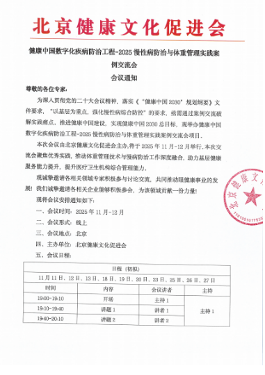 本次会议由北京健康文化促进会主办,将于 2025年11月-12月举行,本次交流会聚焦优秀实践,推动体重管理技术与慢病防治工作深度融合,助力基层健康服务能力提升,提升医疗卫生机构综合管理能力。